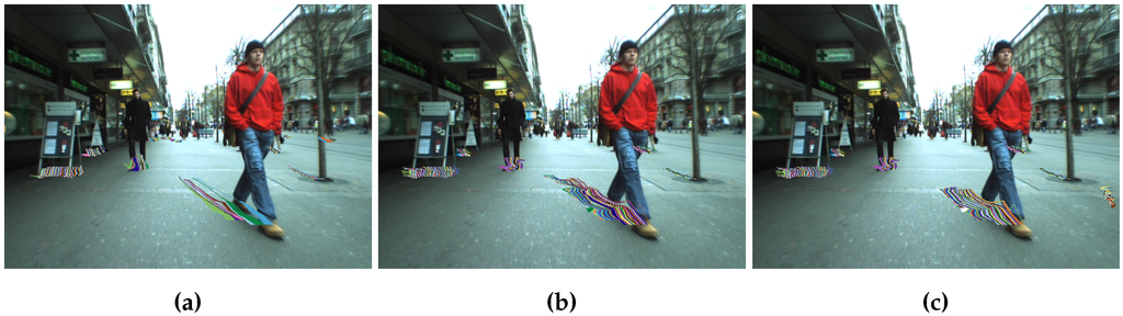 Configurations 1 and 2 [7] fall quite fast, with a recall below 70% after just five frames. Furthermore, the contribution is not clear. Two-level tracking methods yield better results, especially when . The second tracking level filters much of the noise, making tracking more reliable. Figure 16 shows qualitative results for Configurations 1, 5 and 7. The trajectories obtained for Configuration 5 are the longest and smoothest, and the effect of avoiding multiple matches for the same stixel are also evident. In Configuration 1, the trajectories for many stixels start from the same single stixel. Configurations 5 and 6 use and Configurations 3 and 4 . Histograms are normalized just before matching, while the sum of absolute differences is done pixel by pixel. This results in longer tracks in Configurations 5 and 6, since matching is more robust to illumination changes.