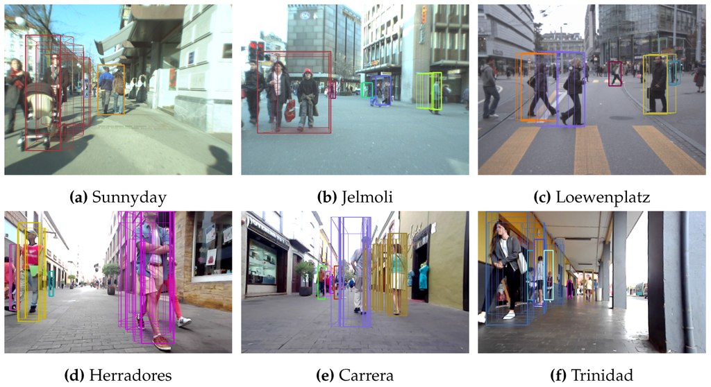 Other sequences processed. The top row shows the output for three very well-known sequences. The bottom row shows the results for the sequences obtained by our vehicle, Verdino, in the environment in which it will operate. (a) Sequence Sunnyday from ETHZ dataset; (b) Sequence Jelmoli from ETHZ dataset; (c) Sequence Loewenplatz from ETHZ dataset; (d) Sequence Herradores obtained from prototype Verdino; (e) Sequence Carrera obtained from prototype Verdino; (f) Sequence Trinidad obtained from prototype Verdino.