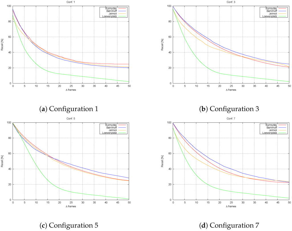 In this section, we analyze recall as a function of Δ frames. The tests from the previous section are repeated, but now, the time step between frames is increased k frames each time, with s (from 1 up to 20 fps, in a 15-fps video). Figure 17 shows recall versus time step increment. Four different profiles are detected involving Configurations 1 to 7. This tests also confirms that is negligible. The most tolerant configuration is 7, since the object-level based tracking is able to handle slightly larger changes than stixel-level tracking.