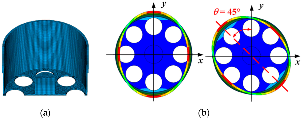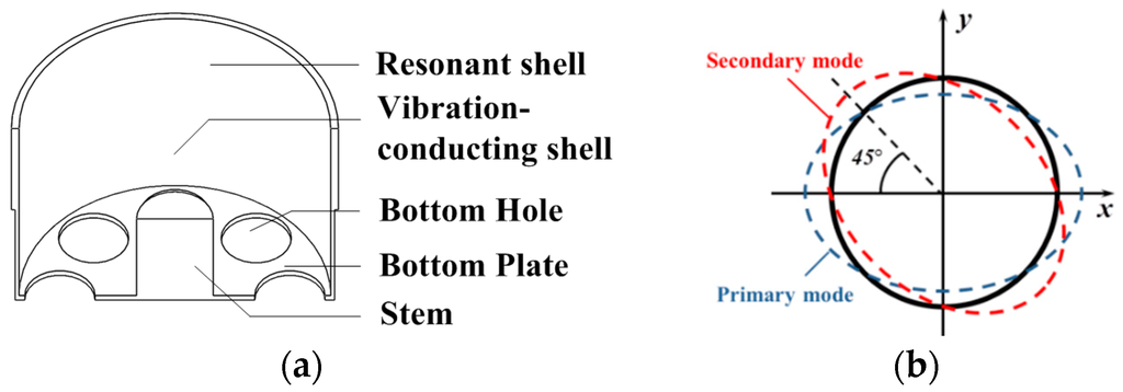 The structure of the monolithic cylindrical fused silica resonator is shown in Figure 1a. The resonator comprises a cylindrical resonant shell, a vibration-conducting shell, a bottom plate with eight holes equi-angularly distributed on, and a rigid stem on the bottom plate inside the cylindrical shell. The cylindrical resonator works at the n = 2 wineglass mode, with n referring to the number of circumferential node lines with respect to the axis of symmetry. For an ideal cylindrical resonator, the n = 2 wineglass mode actually includes two degenerate modes with the same natural frequencies and an angular interval of 45°, as depicted in Figure 1b, and they do not have a determined angular location around the axis of symmetry. These modes are often referred to as primary and secondary mode for excitation and detection mode, respectively. The finite element model was built using Ansys Multiphysics 14.0 software, as depicted in Figure 2a, and the simulated n = 2 wineglass mode was shown in Figure 2b. The cylindrical shell is the main vibrating body of the resonator, thus it demands extremely high machining precision. The vibration-conducting shell is considerably thinner than the cylindrical shell and the requirement on its machining precision is less stringent. The holes on the bottom plate ensure that the excitation and detection elements excite and detect the vibration mode of the resonator instead of membrane vibration of the bottom plate [19]. Furthermore, they may block the heat flow of the bottom plate while it deforms, thus decreasing the overall thermoelastic damping [20]. The rigid stem is used to fix the resonator, usually by gluing with epoxy or by indium bonding. In this design, the resonator can be excited and detected either by piezoelectric effect or by electrostatic force depending on the electrode design.