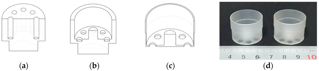 Schematic of the manufacturing process of the monolithic cylindrical fused silica resonator: (a) The frock was roughly ground and holes were formed during the first step; (b) The inner surface was finely finished during the second step; (c) The outer surface and the bottom plate were finished during the last step; (d) The photo of monolithic cylindrical fused silica resonators.