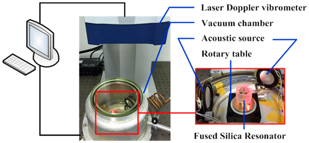 The experimental setup includes a Polytec laser Doppler vibrometer, a vacuum chamber, an acoustic source and a rotary table. This setup allows non-contact characterization of the resonator.