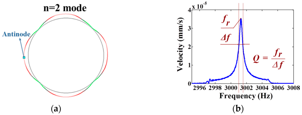 Results show that, a 6-degree change of the excitation direction leads to only 0.5% variation of the antinode Q factor, and a 25-degree change of the excitation direction results in no more than 2% variation of the antinode Q factor. Therefore, the Q factor testing procedure is carefully designed as follows. First the resonant frequency fr of the resonator is sought out by exciting the resonator with a sweeping signal in a relatively wide frequency range. Then the resonator is excited by a sinusoidal signal with its resonant frequency, during which the vibration pattern is recorded and the antinode is determined, as shown in Figure 5a. Then the resonator is again excited by a sweeping signal in a narrower frequency range, so as to have a better measurement resolution, and the vibration at the antinode is recorded.