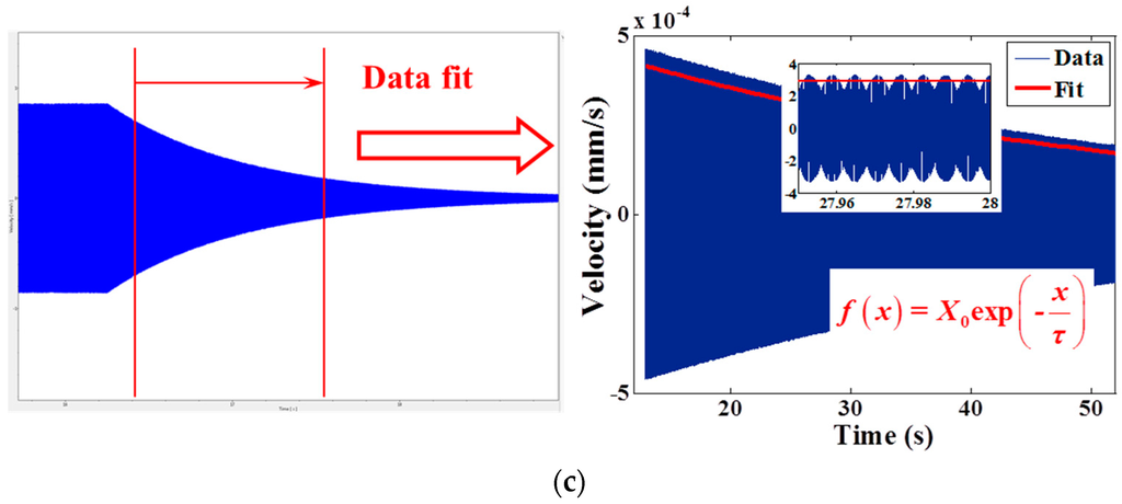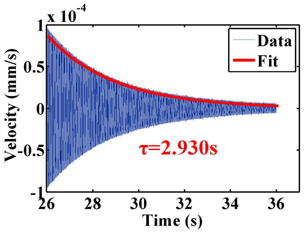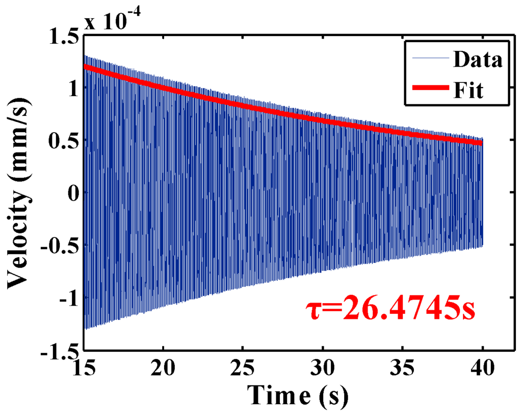 Specifically, the data recorded is typical exponentially damped sinusoidal signal. We have calculated the frequency of the signal by fast Fourier transform, and found the difference between the calculated frequency and the excitation frequency was on the order of 10−3 Hz. Therefore we use the frequency of the excitation signal obtained during frequency sweeping as a good approximation to calculate Q in the ring-down time method. We use cubic spline interpolation to derive the upper envelope of the signal, and then fit the envelope with exponential function by least square nonlinear fitting. As shown in the enlarged picture in Figure 5, the decay curve has beating with a period of roughly 6 × 10−3 s, which is caused by the insufficient sampling frequency provided by the FFT mode of the laser Doppler vibrometer. The error caused by this effect should be on the order of 10−3 s.