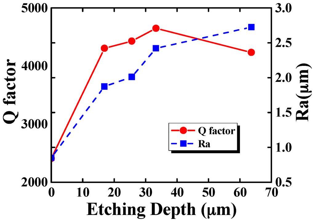 The chemical etching procedure proposed in [25,26] was employed, and resonators CR01, CR05 and CR06 were chemically etched. For each etching round, the etching depth was measured by the Werth Messtechnik GmbH measurement microscope and the surface roughness was measured by a Taylor Hobson (Berwyn, PA, USA) profiler.