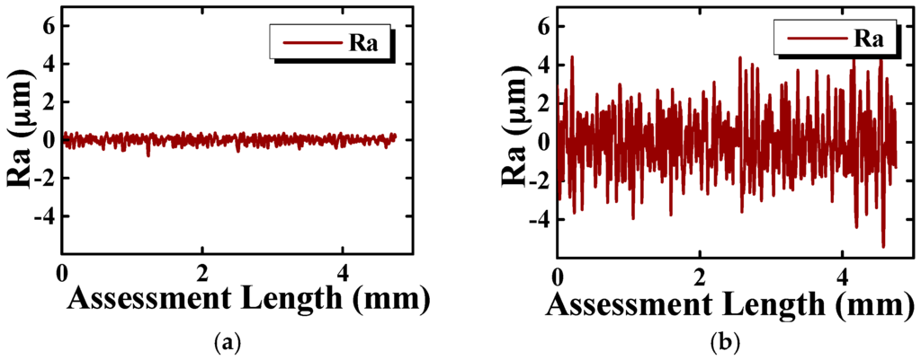 Surface roughness of CR01. (a) The surface roughness plot before chemical etching; (b) The surface roughness plot after chemical etching.