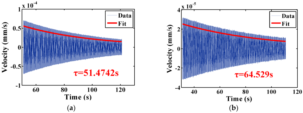 Ring-down time experiment of resonator CR05 and CR06 in moderate vacuum. (a) Resonator CR05 shows τ = 51.4742 s at f = 4453.49 Hz, giving a Q factor of 720,178; (b) Resonator CR06 shows τ = 64.529 s at f = 3974.35 Hz, giving a Q factor of 805,898.
