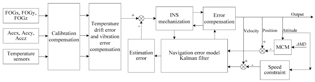 Figure 1 is the overall design of FOG-Based MWD. It contains three FOGs, three accelerometers and six temperature sensors. First of all, the inertial sensors collect the motion information of the MWD. Then, the sensor data are compensated for the removal of the fixed bias, temperature drift error, vibration error, etc. The bias and scale factor are obtained according to the model and calibration method which are described in the literature [17]. According to the characteristics of MWD, the temperature data is obtained by the slow self-heating, and the temperature drift error model is established using the multiple linear regression method. The vibration error model is established using grey neural network theory. Finally, the velocity, position and attitude of the MWD are obtained by inertial navigation algorithm. In order to suppress the error growth, the Kalman filter (KF) is used for integrated surveying algorithm. The estimation errors include random bias of FOGs, random bias of accelerometers, velocity error, position error and attitude error. All the estimation errors are compensated in real time. Section 2.4.2 corresponds to INS Mechanization block in the schematic of Figure 1. In this paper, the focus is the error growth with time, so the process and the methods of temperature and vibration error compensation are not discussed in detail.