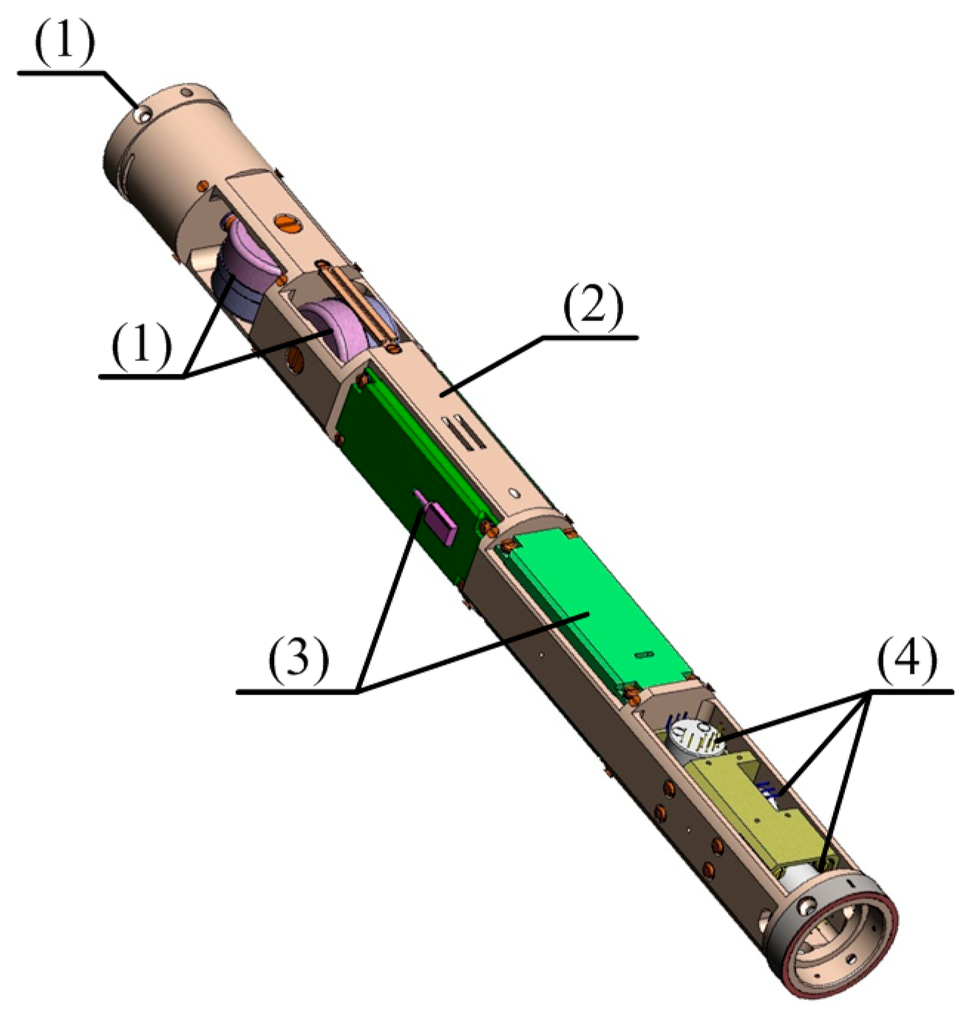 In the oil industry, the size of the MWD surveying system is very restricted, and three full FOGs cannot be directly installed. In this work, the three-axis integrated and flexible manufacturing technology is developed to design the IMU. The three-axis FOG has only one light source, which reduces the component size to satisfy the size requirement and also reduces power consumption. Moreover, the fiber rings, processing circuits, and light source are arranged independently along the mechanical body. Consequently, the FOGs have better temperature performance. This novel design method improves the FOGs performance. The IMU integrative structure is shown in Figure 2, where (1) is the module of 3-D fiber ring; (2) is the mechanical body; (3) is the module of processing circuit of 3-D FOG; (4) is the module of 3-D accelerometer. One light source was installed under the processing circuit.