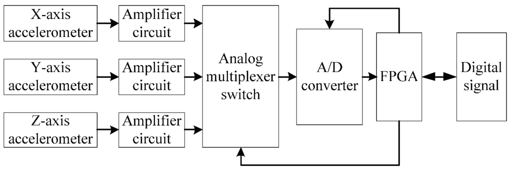The principle of the accelerometer signal acquisition is shown in Figure 3. First of all, the output of accelerometer is sampled and amplified. Secondly, one of the three signals is chosen by the analog multiplexer switch and converted by the A/D converter. Thirdly, after the conversion is complete, the three digital signals are outputted by FPGA. The analog multiplexer switch and A/D converter are controlled by the FPGA.