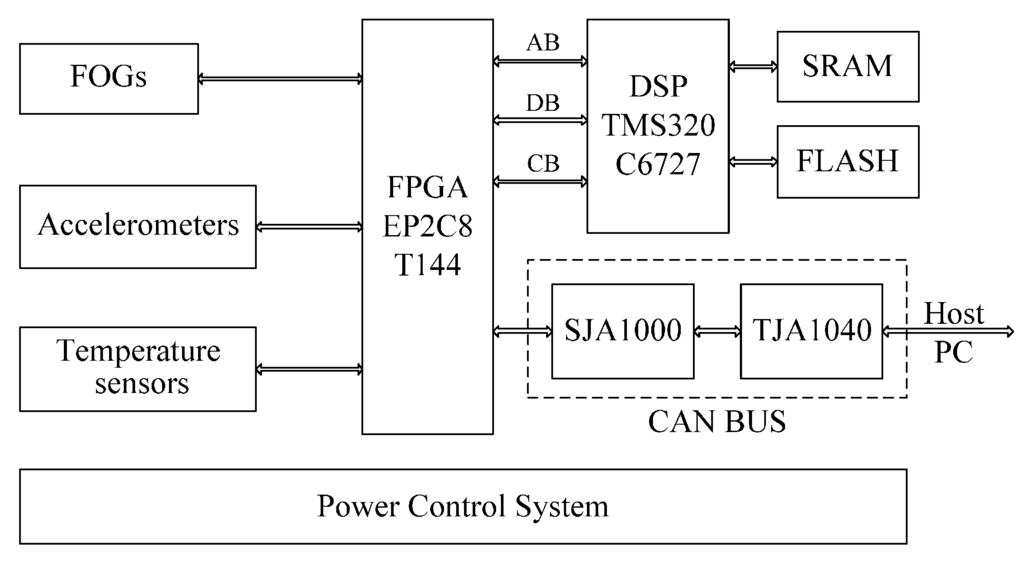 The navigation computer is mainly utilized to collect all sensor data, preprocess data and run the navigation algorithm. The principle of the navigation computer is shown in Figure 4. The floating-point digital signal processor (DSP) is chosen as the navigation computer processor. The DSP has a high processing speed and can run complex navigation algorithms. A high performance core Field Programmable Gate Array (FPGA) is chosen as data acquisition and input/output (I/O) interfaces for output data of gyroscopes, accelerometers and temperature sensors. The CAN bus is used as the interface of the MWD surveying system.