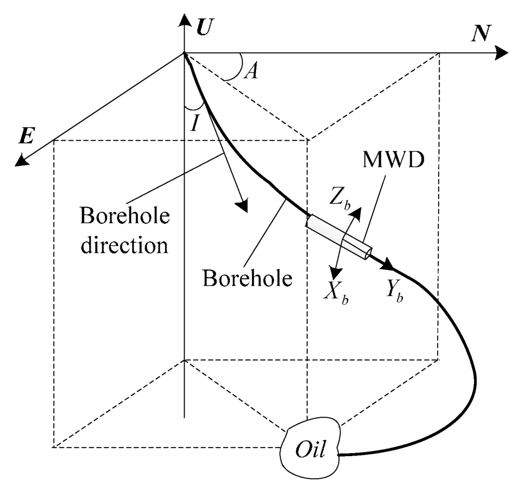In the oil industry, borehole trajectories needs to be measured accurately in drilling engineering and geological work [1,2]. Measurement-while-drilling (MWD) surveying systems provide the position and the orientation of the bottom hole assembly (BHA) in real-time during drilling. Present MWD surveying systems consist of three-axis accelerometers and three-axis magnetometers mounted inside special non-magnetic drill collars [3]. However, using magnetometers has a deleterious effect on the overall accuracy of the surveying process, since the drill string components contain magnetic interference, geomagnetic influences, and downhole ore deposits, which are randomly located and cannot be predicted [1,2]. This magnetic interference effect is reduced, but not eliminated, by utilizing long lengths of non-magnetic drill collars, but this solution increases the drilling technology costs due to the relatively high cost of these non-magnetic materials [4]. Meantime, the MWD surveying system is not capable of monitoring the drill bit in time since the MWD needs to be installed at least 15 m behind the drill bit due to the non-magnetic drill collar use [1].