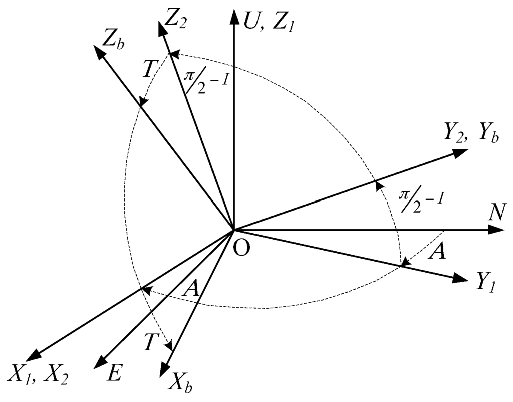 The device transforms a fixed location to the current location through a rotation matrix. As shown in Figure 6, the navigation coordinates are used as a reference frame with a positive clockwise rotation. First, an angle of A rotates around to the coordinates X1Y1Z1, then an angle of rotates around to the coordinates X2Y2Z2, and an angle of T rotates around to the coordinates XbYbZb which are the device body coordinates. Here T is the toolface angle that indicates the MWD instrument rotation around the axis.