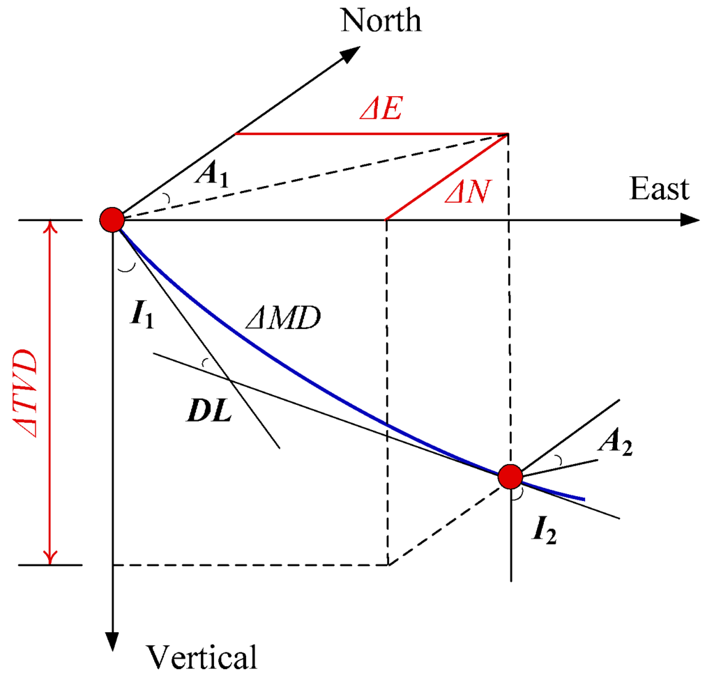 In Figure 7, inclination and azimuth angles at station 1 are denoted as I1 and A1, respectively, while the inclination and azimuth angles at station 2 are denoted as I2 and A2, respectively. The MCM fits a spherical arc between the two stations by calculating the curvature “DL” from the 3D vectors and scaling by a ratio factor (RF). When the first station positions are known, the second station positions is computed using the following expressions [25]: