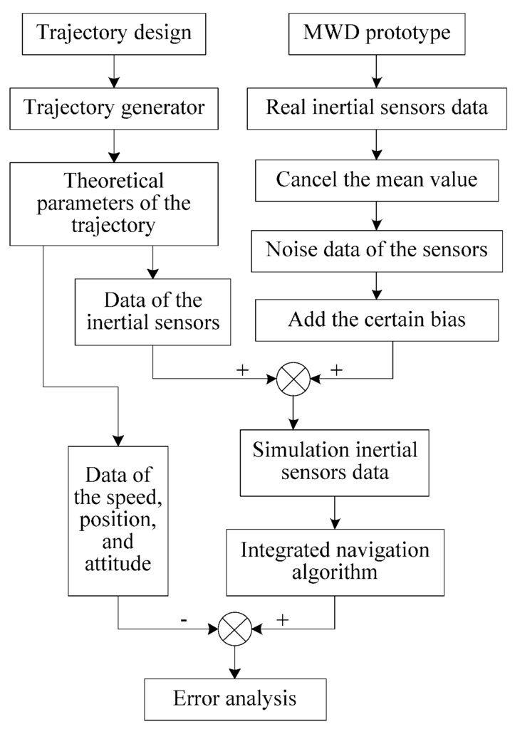 First of all, the trajectory of the oil borehole is designed, and the theoretical parameters of the trajectory are generated by a generator, including the three-axis angular velocity, three-axis acceleration, attitude, velocity, and position of the MWD. Secondly, the noise data of inertial sensors were acquired from the FOG-based MWD prototype. Thirdly, the simulation inertial sensor data were obtained from the theoretical three-axis angular velocity and acceleration added to the noise data, respectively. Then, using the simulation inertial sensors data, the errors produced by proposed method are compared with those produced by the traditional method.