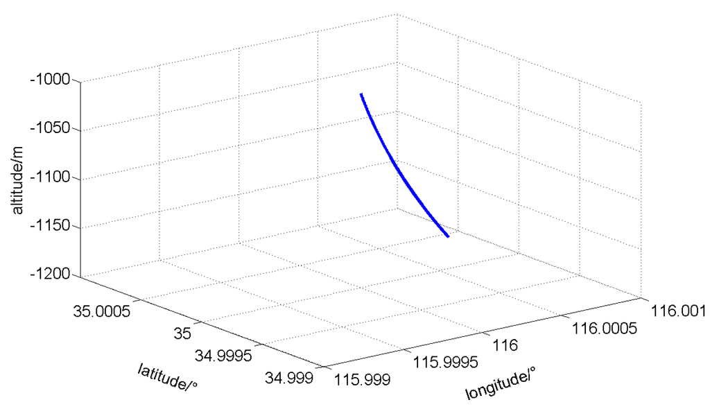 The parameters of the generated standard trajectory are as follows: the initial longitude is 116°, latitude is 35°, and altitude is −1000 m. The original azimuth angle is 180°, inclination angle is 20°, and the toolface angle is 0°. The time of the whole process is 5100 s, the move speed of MWD is 2 m/min along the drilling pipe, and every 5 min the MWD instrument stops 1 min (for ZUPT) [4,9]. The drilling pipe length is provided each 10 m. During the whole process, azimuth and toolface angles remain unchanged, while the inclination angle changed by 30°. The generated standard trajectory according to the conditions mentioned above is shown in Figure 9.