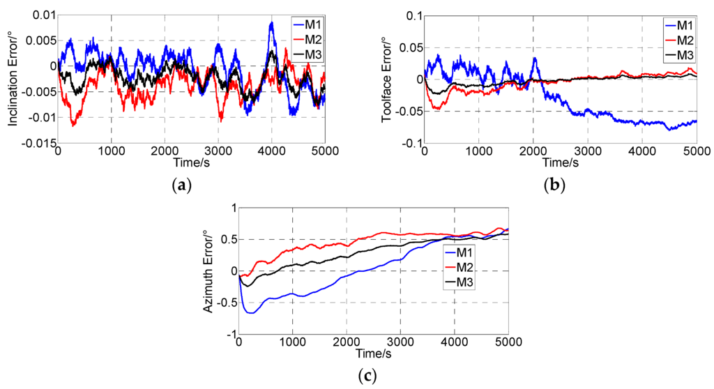 Both the inclination and the toolface errors were limited over time, while the azimuth error continued to increase. The main reason for such characteristics is that the external observation of all the methods is only concerned with acceleration. This drift in the azimuth angle appeared due to a FOG bias error, while the inclination and toolface angles are related to the accelerometer error more than the FOG error. The drift in the azimuth angle could not be compensated by the Kalman filter because the azimuth orientation is not coupled with the velocity or the position components. Conversely, the drifts in the inclination and toolface angles are compensated.
