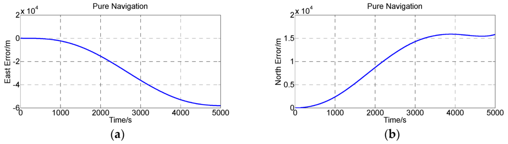 Position errors calculated by the pure navigation. (a) East error; (b) North error.