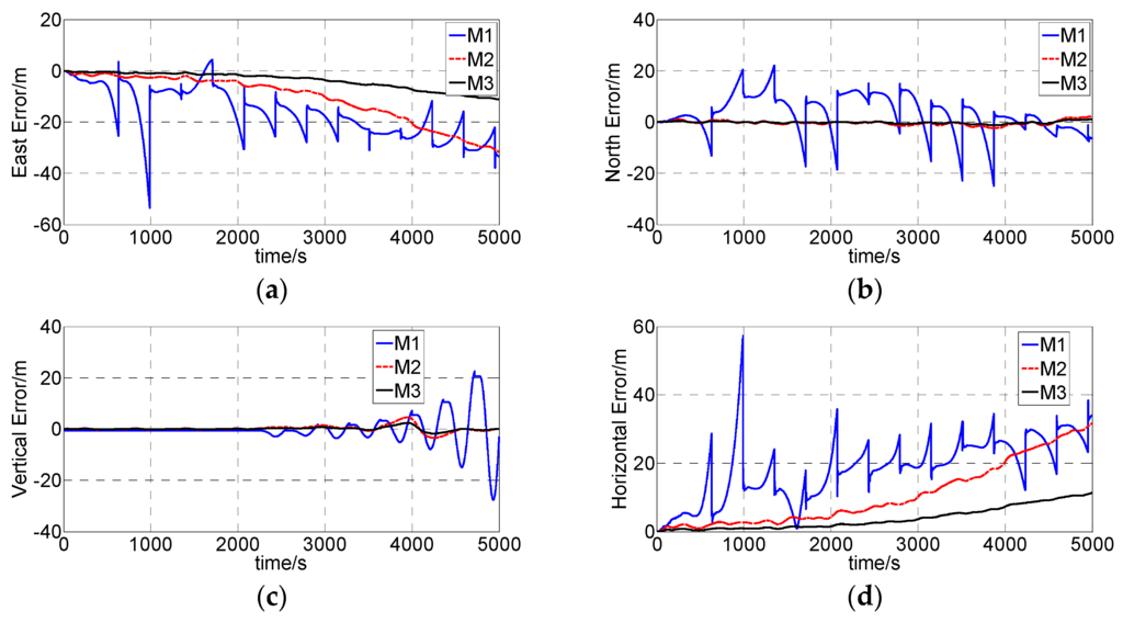 The INS exhibits an unlimited growth error if there is no external observation to update the surveying system. As Figure 10 shows, during the simulation calculation, the east error achieves −58,106 m and the north error achieves 15,802 m. The proposed method and the comparison of the two methods can successfully suppress the error growth (Figure 12). No matter what method is adopted, the error cannot be eliminated clearly and the error will grow over time.