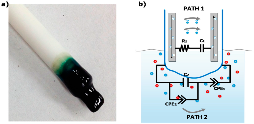 (a) Picture of the polyvinyl chloride-bis(2-ethylhexyl) phthalate (PVC-BEHP) electro-chemical nitrate sensor; (b) schematics of the main electrical conduction paths, one within the polymer membrane and the other into the medium under test (taken from Ghaffari et al. 2015) [].
