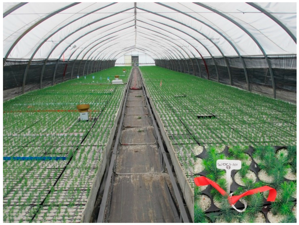 Several details regarding the production of white spruce seedlings related to irrigation, fertilization and different cultivation techniques are described in detail in previous publications [,].