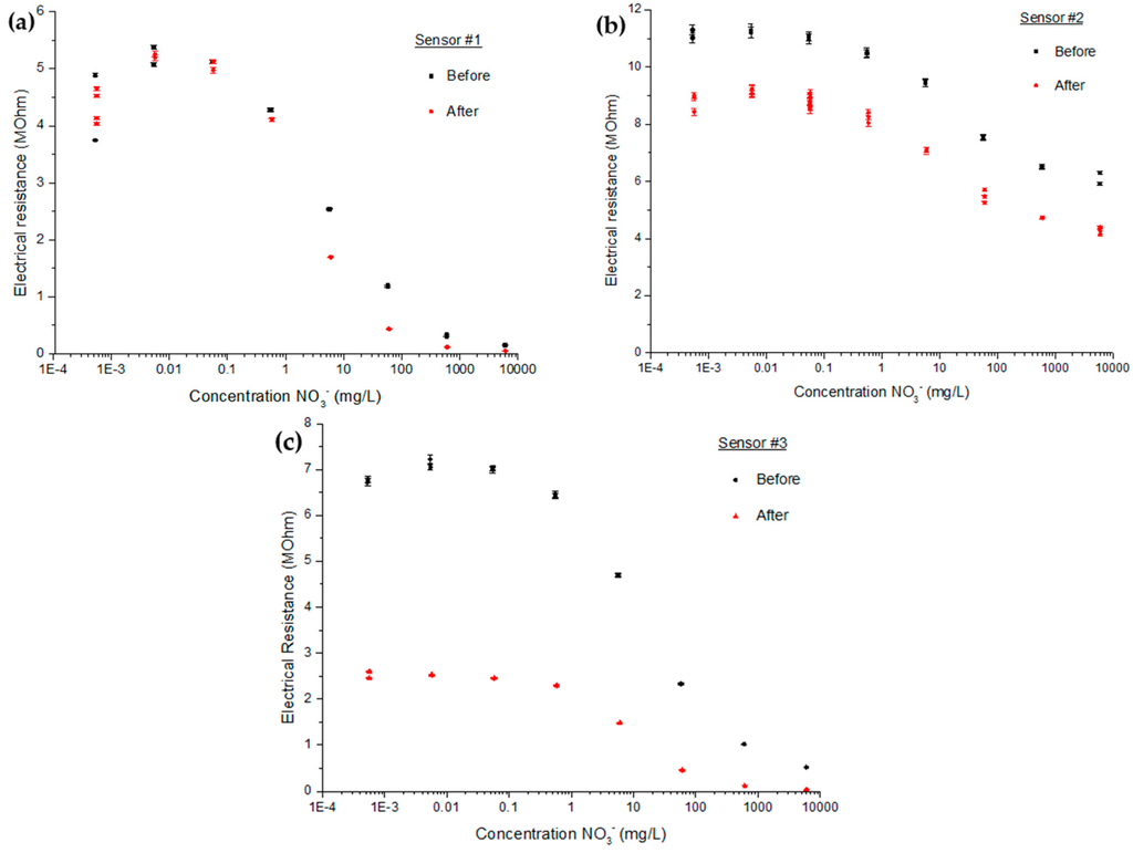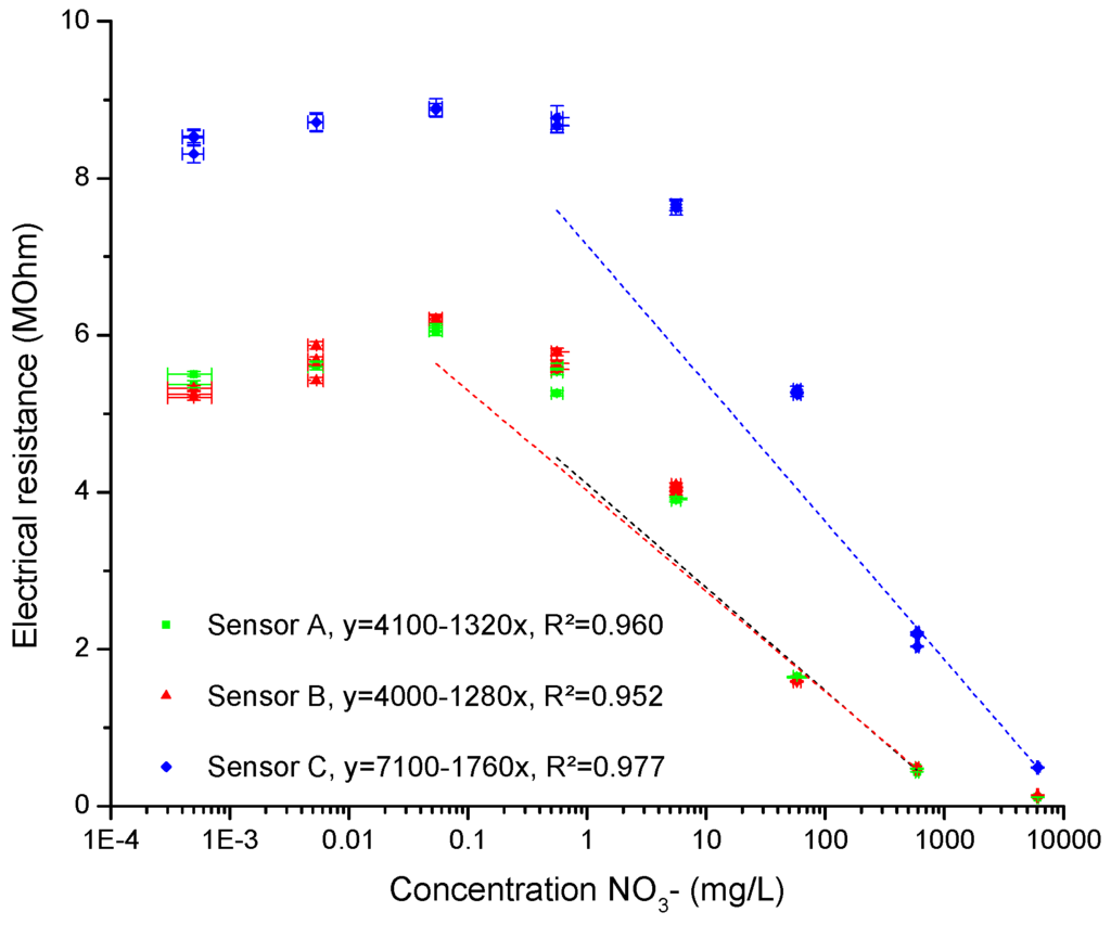 After drying, each sensor was calibrated using a KNO3 solution covering a large selection of concentrations (10−8 to 10−1 mol/L). For the sake of continuity and comparability, the concentration values will be given in mg/L of NO3−. Every sensor read the impedance in each solution three times. The resulting resistance measurements obtained using the LCR-meter are shown in Figure 3. The fitting of a linear regression was done over the linear response range. The fitting curve will be used for further measurements.