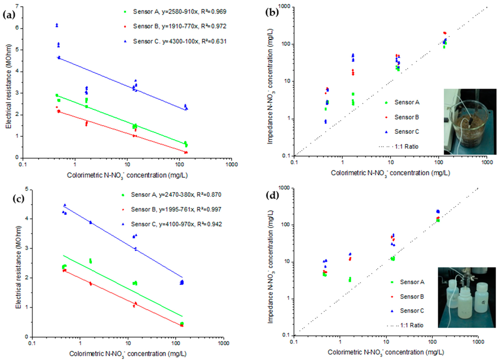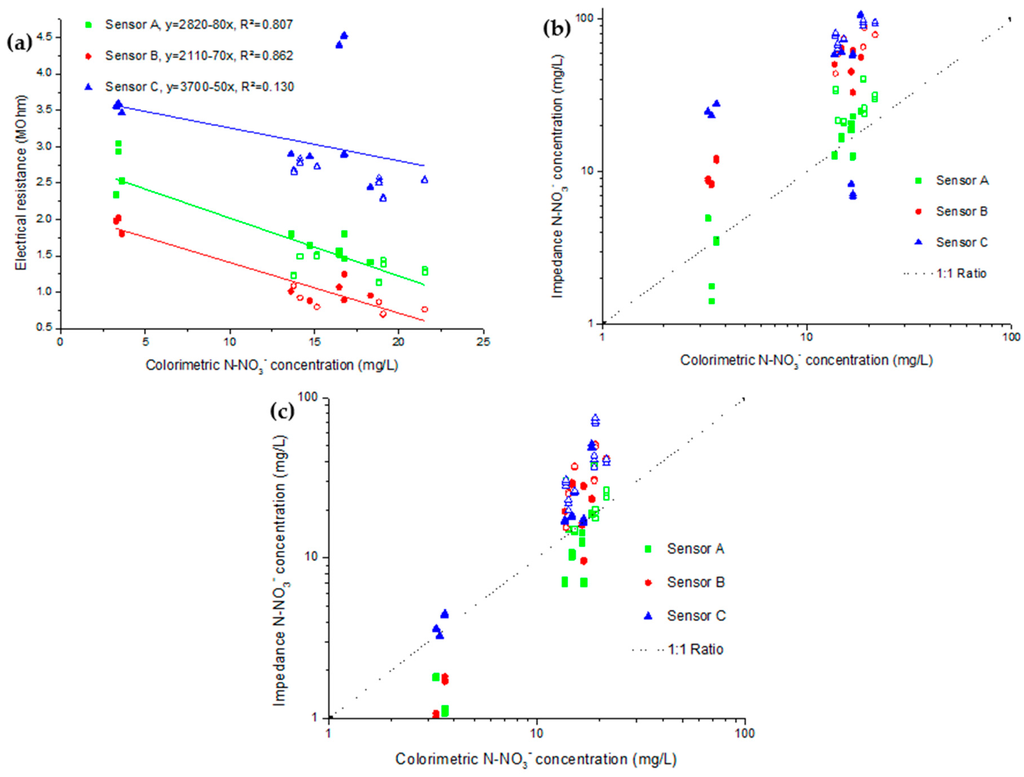 The curve of electrical resistance for the colorimetric nitrate measurement of concentration showed good linear correlation except for sensor C. As for the best fitting related to choosing the good calibration, only sensor A seemed to be close to a good ratio using the solution calibration (Figure 4b). With that calibration, sensor B and C had over-evaluated the nitrate concentration. With the calibration obtained in the saturated substrate (Figure 4c), sensors A and B under evaluated low nitrate concentrations. For the higher concentrations they kept a good correlation. In that scenario, sensor C showed the best tendency. Overall, the calibration obtained in the saturated substrate offered better results as variability at low concentration is quite small considering that the results are presented logarithmically.