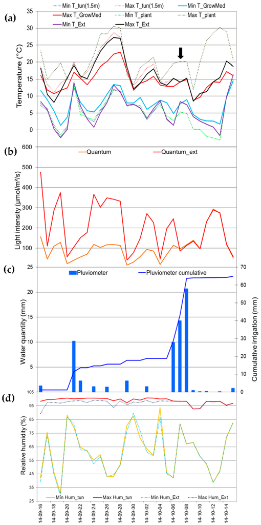 A data acquisition system (model CR10X, Campbell Scientific, Edmonton, AB, Canada) was used to record different environmental variables inside and outside the tunnel. Temperatures in the growing medium surrounding the roots and at the substrate surface were continuously monitored (soil temperature probe model 107B, Campbell Scientific) under unheated tunnel conditions. Air temperature and relative air humidity inside the tunnel at 2.0 m above the ground surface were measured with a Vaisala RH and Temperature Probe (model HMP35C, Campbell Scientific). Three rain gauges (Model TE525M, Campbell Scientific) were used to monitor the quantity of water applied to plants during fertilization and irrigation. Light intensity was also measured continuously (model quantum sensor, Campbell Scientific).