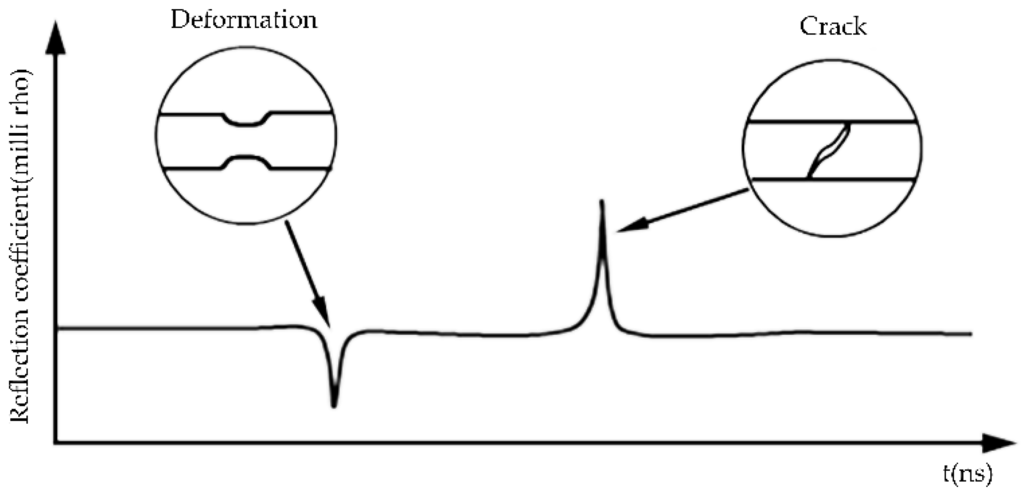 Equation indicates that the characteristic impedance of the sensing line has a distributed feature. For an ideal coaxial cable, the EM wave propagating along the sensing line will not be reflected since the characteristic impedance is constant and uniform. If there is a load-induced local deformation of the cable’s cross-section, or if a change in topology of the cable’s outer conductor happens, an impedance discontinuity will be present along the sensing cable, which, in turn, results in the signal reflection at the point of discontinuity. As shown in Figure 1, the reflected step signal carries the information about the location and severity of the discontinuity. The position of the discontinuity, measured from the monitoring point can be determined by: