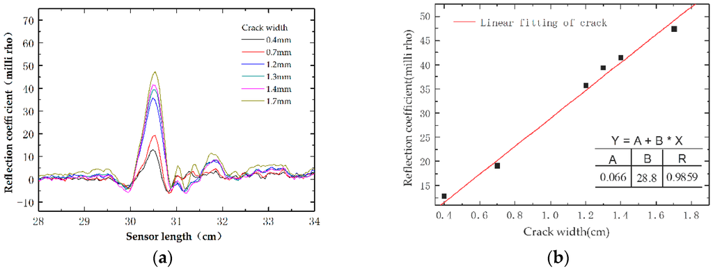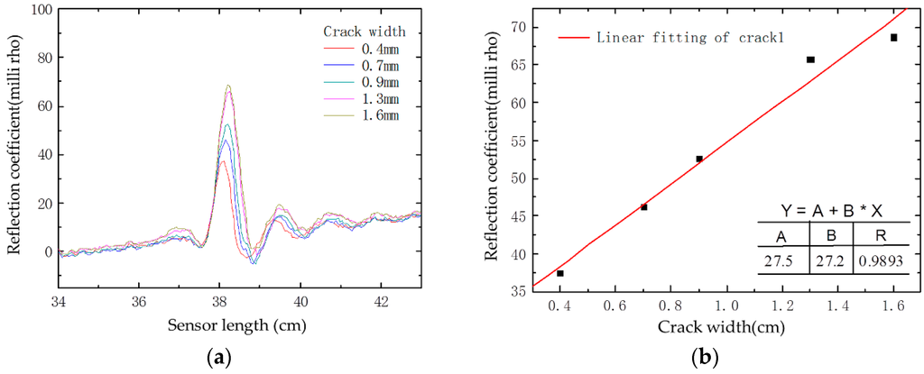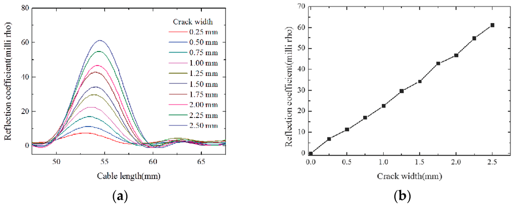 Under progressive loading, two dominant cracks appeared at two loading points in the four-point bending test as presented in Figure 16a. Two spikes corresponding to the cracks’ locations capture and clearly identify the cracks from the reflection waveform as shown in Figure 16b. Therefore, the embedded sensor is capable of detecting multiple cracks. Figure 17 indicates the waveform of crack1 as an example. The crack width grows gradually from 0.4 mm to 1.6 mm with the increase of applied loading. From Figure 17a, we can observe that reflection coefficient changes generally as the crack develops. The peak values of the reflection coefficient induced by crack1 are plotted in Figure 17b, acting as a function of crack width. It shows that the peak values increase linearly as the crack width enlarges. These results imply that the prototype sensor has the ability of multiple crack monitoring.