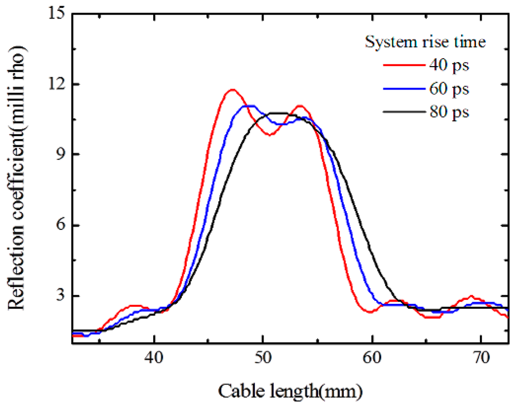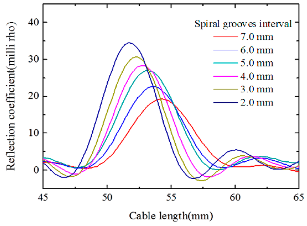 Figure 5a shows the simulated ETDR waveforms of the sensor with a fixed spiral separation length of one turn and a spiral groove interval of 6 mm, and a different crack width from 0.25 mm to 2.5 mm with an increment of 0.25 mm. Figure 5b illustrates the relationship between the peak values of the reflection coefficient and the crack width. Simulation results demonstrate that the peak values of the reflection coefficient increase almost linearly within the crack width. For the simulated sensors with a fixed spiral separation length of one turn and a crack width of 1.0 mm, when the spiral groove interval changes from 2.0 mm to 7.0 mm with an increment of 1.0 mm, the peak values of the reflection coefficient gradually decrease as shown in Figure 6. It indicates that the sensitivity of the proposed sensor is related to the spiral groove interval, and the higher peak value of the reflection coefficient corresponds to a smaller interval of the spiral groove. Therefore, the proposed sensor with a smaller interval of spiral grooves is expected to perform with better sensitivity. To investigate the effect of the rise time of the incident impulse signal on the spatial resolution, a sensor with a fixed spiral separation length of two turns and a spiral groove interval of 6 mm, as well as a crack width of 0.5 mm was simulated. According to Figure 7, there are two clear peaks in the response waveforms when the rise time is 40 ps, however, the two response peaks become gradually indistinct with the increase of the rise time. It means that the spatial resolution is related to the rise time of incident impulse signal, and a smaller rise time can lead to a higher spatial resolution.