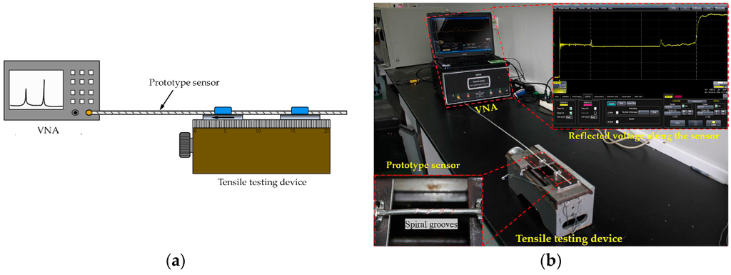 In this part, the crack detecting capability of the prototype sensor was investigated using a test system, which consists of a vector network analyzer (VNA), a tensile testing device and a prototype sensor. The overall setup of the experiment and their schematic representations are shown in Figure 8a,b, respectively. The VNA used in the system has a 40 GHz measurement bandwidth and launches the Gaussian pulse with a rise time of 6 ps. The tensile testing device, capable of measuring micro-displacements, can elongate the cable with the minimum stepping movement of 0.01 mm. The commercial semi-rigid SFT-50-3 coaxial cable was selected to fabricate the sensor following the method of the above third part. Table 1 lists the geometric configuration and electrical properties relevant to the sensing characteristics of the sensor.