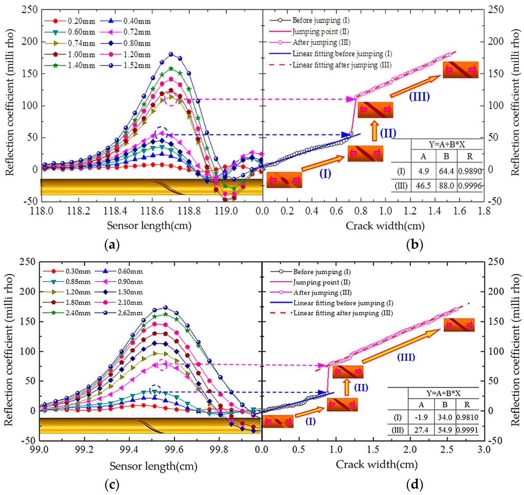 Test results: (a) reflection coefficient distribution along Sensor-I; (b) reflection coefficient variations with crack width of Sensor-I; (c) reflection coefficient distribution along Sensor-II; and (d) reflection coefficient variations with crack width of Sensor-II.