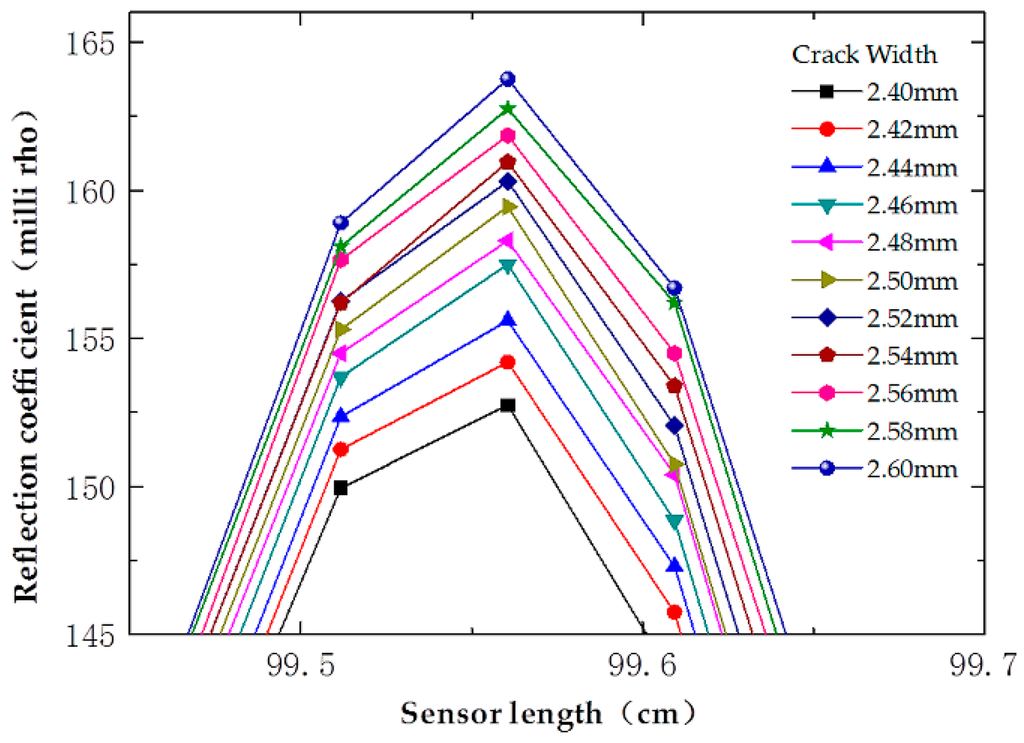 To verify the resolution of the prototype sensor, response waveforms of Sensor-II are partially enlarged and presented in Figure 10, under different crack widths that vary from 2.40 mm to 2.60 mm, with an increment of 0.02 mm. It can be concluded that the prototype sensor can distinguish the crack width of 0.02 mm.
