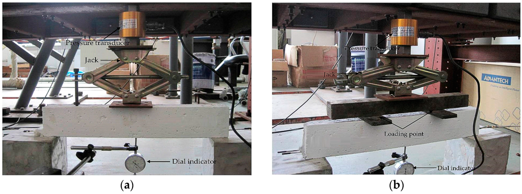 Test setup: (a) three-point bending test; and (b) four-point bending test.