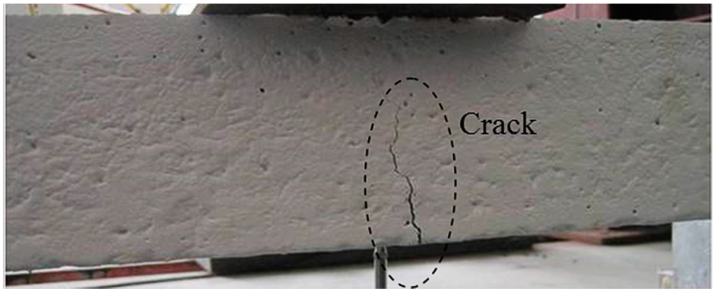 The concrete beam specimens were cast using the commercial C25 concrete mix. A wooden mold was used for casting the sample. During the casting, the sensing cable was held in place by two spring clamps in which a taut tension was exerted to prevent the cable from sagging. The specimens were cured for 28 days before testing. Then step loading on the RC beam was conducted by a reaction frame and a pressure transducer, as well as a jack. A dial indicator was also instrumented at the mid-span of the beam to measure deflections. A strip of narrow steel plate was added in between the loading wedge and the specimen, to prevent a local cracking of the specimen at the point of the load application in the three-point bending test. Photographs showing the test setups of three-point bending test and four-point bending test are given in Figure 13. A quasi-static monotonic bending load with a step load increment of 0.2 kN was applied up to the failure of the specimen. At every load step, the response ETDR signal waveforms of the embedded sensor were acquired using a VNA, and a crack width gauge measures the crack width.