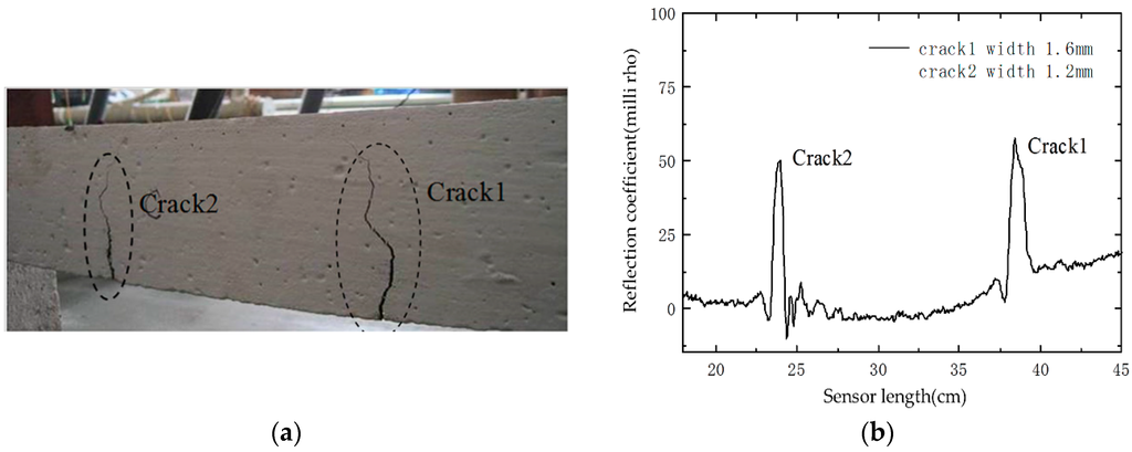Cracking is a major sign of structural aging and damage, which shortens the integrity and service life of structures. While the width of cracks for most ordinary reinforced concrete (RC) structures in civil engineering are over 0.2–0.4 mm, the service life of the structure can be severely shortened due to the erosion of inner steel rebar under harsh environments. Moreover, structures may be damaged if the cracks reach 1–2 mm. Therefore, crack monitoring is essential to guarantee the safety of structures. Currently, many approaches have been developed for crack monitoring, such as ultrasonic methods [1], acoustic emission [2], infrared thermography [3], impact-echo [4], large area electronics [5], etc. All of the techniques mentioned above show good performance of crack detecting, however, they struggled to be applied in practical engineering due to the installation difficulties and vulnerability in the long-term harsh environment. Recently, the optical fiber sensing technology, such as the Bragg grating, the Michelson white light interferometer, and Brillouin scattering have been widely investigated for crack detecting [6,7,8]. However, all of the fibers in the above approaches are silica fibers which are brittle (their elongation rates are only about 1%) [9], which make it easy to break in real applications, and only small cracks can be monitored. Therefore, the brittleness of silica fibers limits the application of the approaches above.