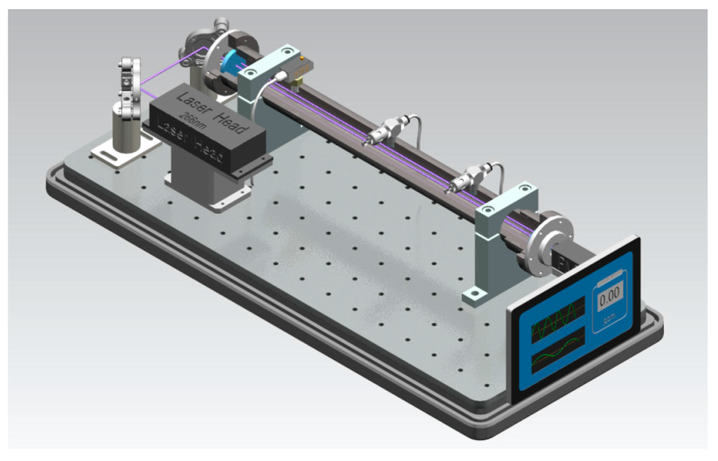 The integrated standalone breath acetone analyzer (LaserBreath-001) developed in our lab is illustrated in Figure 1. All displays, including the ringdown decay waveform and real-time ringdown signals, are controlled via the touch screen. Figure 2 shows a schematic diagram of the optical layout of in the breath acetone analyzer. A Q-switch Nd:YAG laser (Changchun New Industries Optoelectronics, China) equipped with a compact laser head (21.0 mm × 88 mm × 74 mm) was employed as the light source in the breath analyzer. The laser operated at 266 nm with a repetition rate of 1 kHz and single-pulse energy of 4.5 µJ. Except for an iris and two reflective mirrors (Thorlabs PF05-03-F01, Newton, NJ, USA) used to direct the laser beam, the output of the laser was coupled into the ringdown cavity without using any mode-matching optical parts. The gas cell, was comprised of a 50-cm-long stainless steel pipe with an inner diameter of 3.81 cm (CRD Optics Inc., Lompoc, CA, USA), one pair of mirror mounts (CRD Optics Inc., Lompoc, CA, USA), and one pair of high-reflectivity UV mirrors (Los Gatos Research, San Jose, CA, USA, R = 99.99%, radius of curvature = 1 m). Each mirror mount held a mirror whose position could be adjusted in multiple dimensions via three alignment screws. As shown in Figure 2, three ports were located at this gas cell, one was used as a gas inlet and another two were gas outlets, which were connected to a vacuum pump (Oerlikon, SC5D, Cologne, Germany) and a micro pressure manometer (MKS, 870B, Andover, MA, USA) used to monitor the inside cell pressure. In order to ensure the gas cell protected from contaminated, high-purity nitrogen (>99.99%, DaFang Special Gas, Tianjin, China) was used to flush the gas cell each time after one breath sample was tested. A miniature photomultiplier tube (PMT) (R74000U-09, Hamamatsu, Japan) was used as the detector to capture the ringdown decay waveform that was input to an oscilloscope (Tektronix TDS3012B, Beaverton, OR, USA) for display.