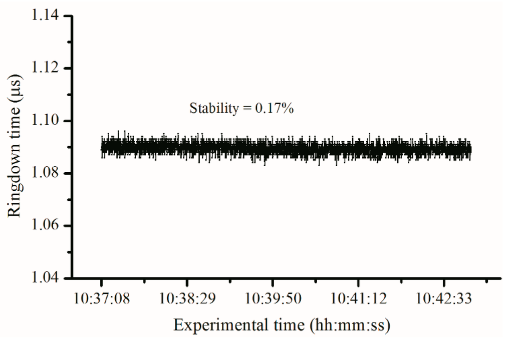 The typical instrument stability in terms of the ringdown time obtained. Each data point is generated from averaging 100 ringdown events, a stability σ/ of 0.17% was measured.