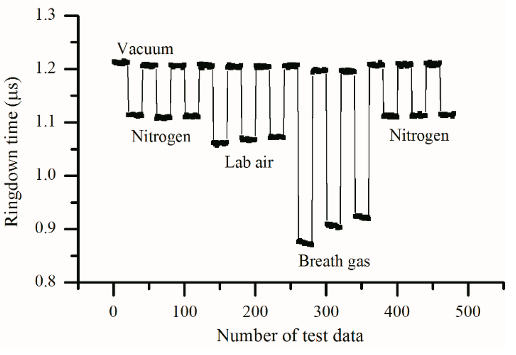 After the breath analyzer was constructed, tests were conducted to check its properties including stability, reproducibility, response time, and the limit of detection. The ringdown baseline scans were obtained in order to test the instrument’s stability. The instrument stability is defined as σ/ where σ and are the standard deviation and average of ringdown time, respectively. The internal pressures of the gas cell were set at low and high levels, i.e., 0 Torr and 730 Torr, by introducing different quantities of laboratory air into the gas cell. As shown in Figure 3, a typical baseline scan of the LaserBreath-001 was obtained with each data point to be generated from an average over 100 ringdown events. The typical baseline stability is better than 0.5%. The mirror reflectivity was characterized to be 99.9% by measuring ringdown time in an empty cell. Figure 4 shows the analyzer’s response to laboratory air at 730 Torr. The sharp rising and falling edges of the signals indicate the rapid response of the analyzer. This test demonstrates the good reproducibility and fast response of the breath acetone analyzer. The decrease in ringdown time when nitrogen and laboratory air fills a vacuumed cavity is due to the Rayleigh scattering at 266 nm, this Rayleigh scattering loss is self-corrected using the background subtraction method [37]. Given the known absorption cross-section of acetone at atmospheric pressure, σ266nm = 4.5 × 10−20 cm2/molecule, using the ringdown baseline stability, 0.5%, and the mirror reflectivity, 99.99%, the theoretical detection limit of the analyzer for acetone is determined to be 30 ppb (parts per billion) based on the 3 − σ criterion.