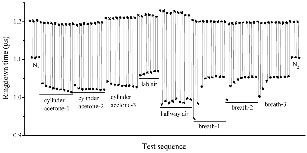 It should be noted that the breath acetone analyzer gave consistent results in the vacuum conditions, measurements of nitrogen, and the laboratory air. However, the successive measurements of a breath samples showed a consistent decrease in acetone concentrations (increase in obtained ringdown times) (in Figure 4). The instability came primarily from the humidity variation of the breath sample. Due to the humidity loss of a breath sample after it was collected and stored in a breath bag, the obtained ringdown times increased in the three successive measurements, and this phenomenon was more obvious when the breath sample was tested right after collection, as can be seen in Figure 5. Three bags of breath sample were collected from the same subject and tested immediately, which were marked as breath-1, breath-2, and breath-3 in Figure 5. The first measured results of these three samples were all dramatically higher (lower in terms of ringdown times) than those that followed, and then reached stable values gradually. In order to confirm the effect of humidity on measured results, cylinder nitrogen, cylinder acetone samples (acetone helium mixture), and atmospheric air were tested. Cylinder nitrogen, laboratory air, and hallway air were tested using the instrument directly, while the cylinder acetone samples were transferred into three bags and tested immediately. The obtained results show that measured ringdown times of nitrogen and acetone samples were consistent, respectively. However, the ringdown times of laboratory air were longer than those of hallway air because the laboratory humidity is lower due to the air cooling and the dehumidification system. Further note that the effect of humidity on the acetone measurements is not due to absorption of water, instead it is due partially to the influence of the breath moisture on the reflectivity of the ringdown mirrors.