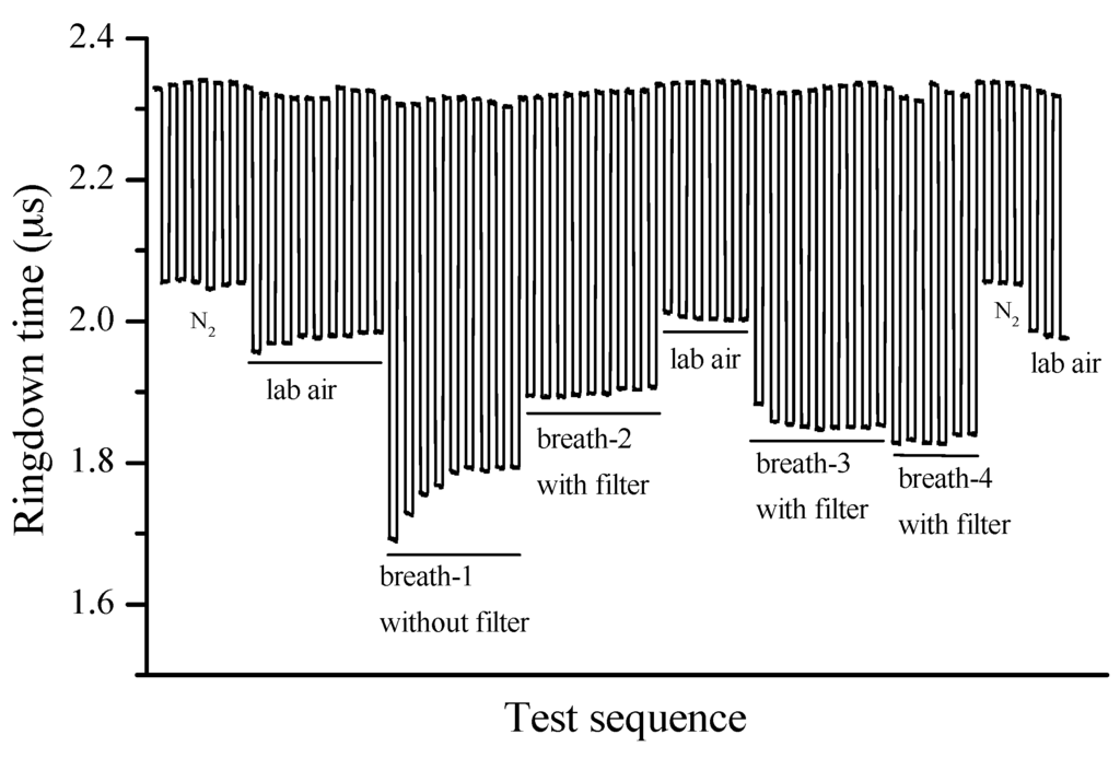 For the purpose of reducing high humidity in the breath samples, a membrane filter with a pore size of 0.22 μm was connected to the instrument inlet port. Figure 6 shows its humidity removal effectiveness. Four breath samples were collected from the same subject and tested right after the breath gas collection. The same humidity effect was observed when a breath sample (marked as breath-1) was tested without using a membrane filter, but the results of another three samples (marked as breath-2, breath-3, and breath-4) were different from the breath-1 sample yet consistent among the three since a membrane filter was used.