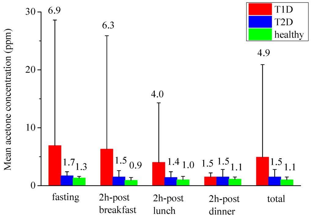 Mean breath acetone concentrations in 22 T1D subjects, 312 T2D subjects, and 52 non-diabetic subjects, under four different conditions: fasting, 2 h post-breakfast, 2 h post-lunch, and 2 h post-dinner. The error bar corresponds to one standard deviation.