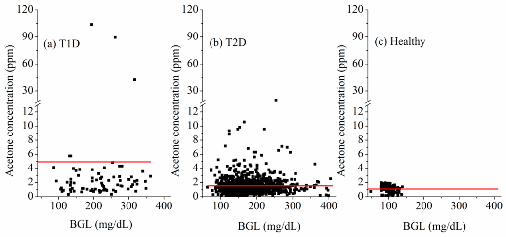 The measured breath acetone concentrations versus BG levels, (a) 22 T1D subjects; (b) 312 T2D subjects; and (c) 52 healthy subjects.