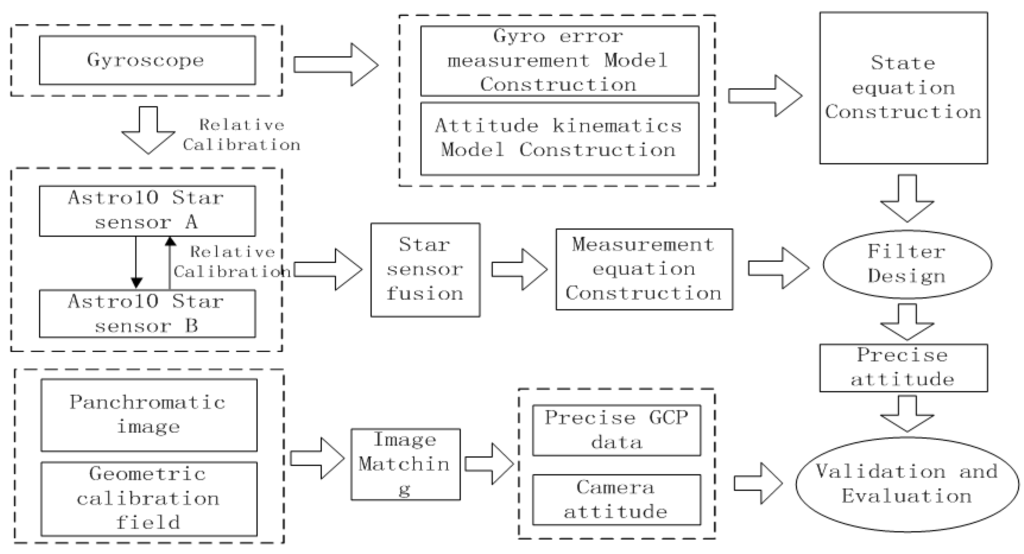 Precise attitude data are a precondition for achieving high-precision geometric positioning of high-resolution optical image processing. The goal of attitude determination is to calculate the attitude parameters in the reference coordinate system on the basis of measurements from the attitude sensors. An attitude determination system consists of the attitude sensor and its attitude-determination algorithm [20]. Therefore, attitude accuracy depends on the accuracies of both the measurement and the calibration algorithm. On-satellite attitude sensors on high-resolution optical satellites include an infrared Earth sensor, a Sun sensor, star sensor, and gyro inertial sensors, etc. In general, the data of the star sensor and gyroscope are combined to determine the precise attitude parameters for high-resolution optical satellites [22,23,24].