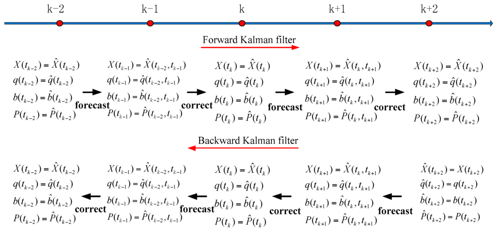 Schematic diagram of attitude data processing with bidirectional Kalman filter.
