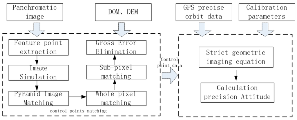 To achieve high-precision image geometry processing for attitude determination of a high-resolution optical satellite, many attempts have been made in remote sensing and geoscience applications, including deterministic method such as TRIAD, QUEST, FOAM, SVD, Euler-q, ESOQ-2, which are based on vector observations, and the state filtering estimation method such as SOAR, q-EKF, Filter QUEST, and REQUEST methods [7,8,9,10,11,12]. Meanwhile, correlation algorithms for precision geometry processing of optical images have matured, including (to name a few), the tight geometric-imaging, rational polynomial-fitting, and pixel-pointing angle models, among others [2,3,4,13,14,15,16]. In particular, in recent years platform jittering and sub-meter image processes have become hot topics. Typical methods include tremor detection that are based on the calibration field, and tremor image geometry compensation based on a high-frequency angular displacement sensor [1,17,18,19]. However, to our best knowledge current studies are scarce; most are based mainly on simulation data, but lack the validation of real data. Due to the intrinsic nature of attitude, the issue of how to evaluate and verify its accuracy effectively also remains unsolved. Fortunately, our research has been dedicated to undertake intensive research in this area. Therefore, we introduce what we have undertaken recently to fill the perceived research gap.