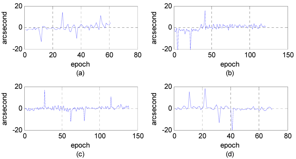 Naturally, certain unusual errors may occur during star sensor observation. Therefore, the quality of the observational data should be controlled first. Suppose that at time t, the quaternion observation value of Sensor A is , and that of Sensor B is . We could place the satellite body into the inertial rotation matrices and :
