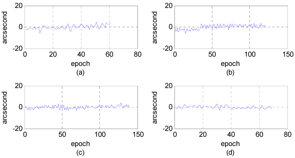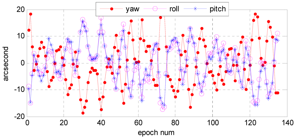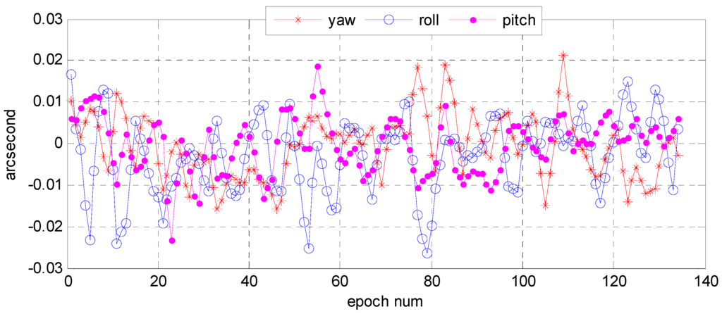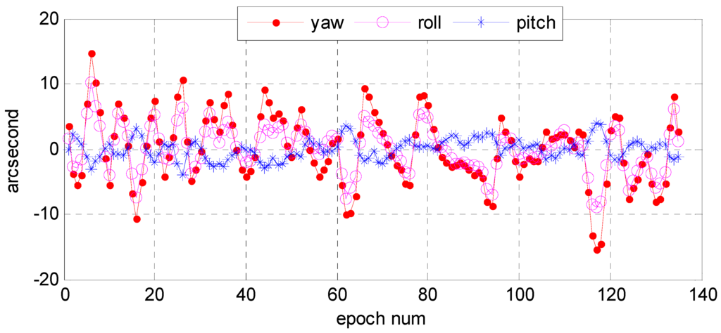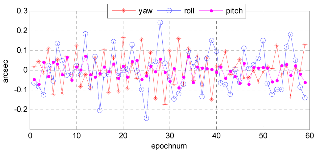 Finally, how to evaluate the relative and absolute accuracies of the attitude result obtained from the proposed algorithm was important. The experimental results show that the relative accuracy of the attitude data was 0.3–0.5 arcsec, and the relative geometric accuracy in the cross-track and along-track directions was between 1.5 and 2.0 pixels. The attitude determination accuracy of star sensor configured by the satellite was 5 arcsec, while the uncontrolled positioning precision of satellite’s panchromatic image was within 15 m. Therefore, both conclusions confirmed each other. In addition, the uncontrolled and relative geometric positioning accuracy of the panchromatic image could be effectively improved, when comparing to the result based on on-board attitude data.