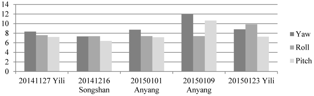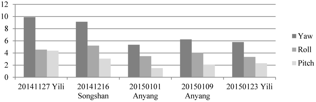 The attitude data used to fit on different fitting models were down-sampled from 8 to 4 Hz, allowing us to use different fitting models to fit attitude parameters of different forms of expression. Finally, we used 8 Hz attitude parameters as reference values to evaluate the fitting accuracy. Figure 22, Figure 23 and Figure 24, describe respectively, the attitude fitting accuracy distribution in the Lagrange polynomial interpolation, orthogonal polynomial fitting, and spherical linear interpolation models.